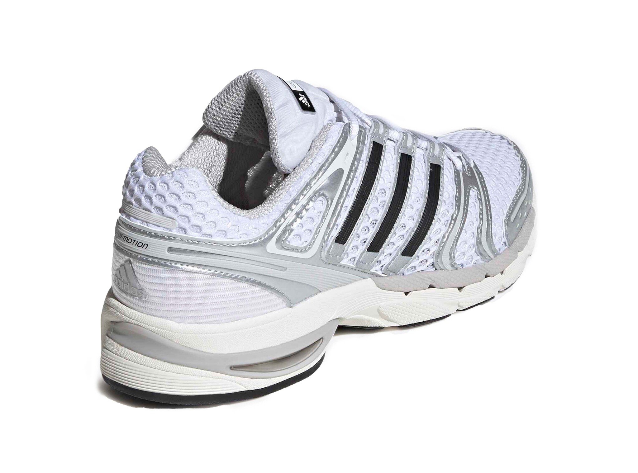 The Adidas Adistar Control 5 in White, Grey and Silver blends a retro running design with modern comfort technology. The breathable mesh upper with synthetic overlays provides support and ventilation, while the EVA midsole ensures comfortable cushioning with every step. The neutral colors with silver accents create a sporty and versatile look, ideal for both casual outfits and active styling.
