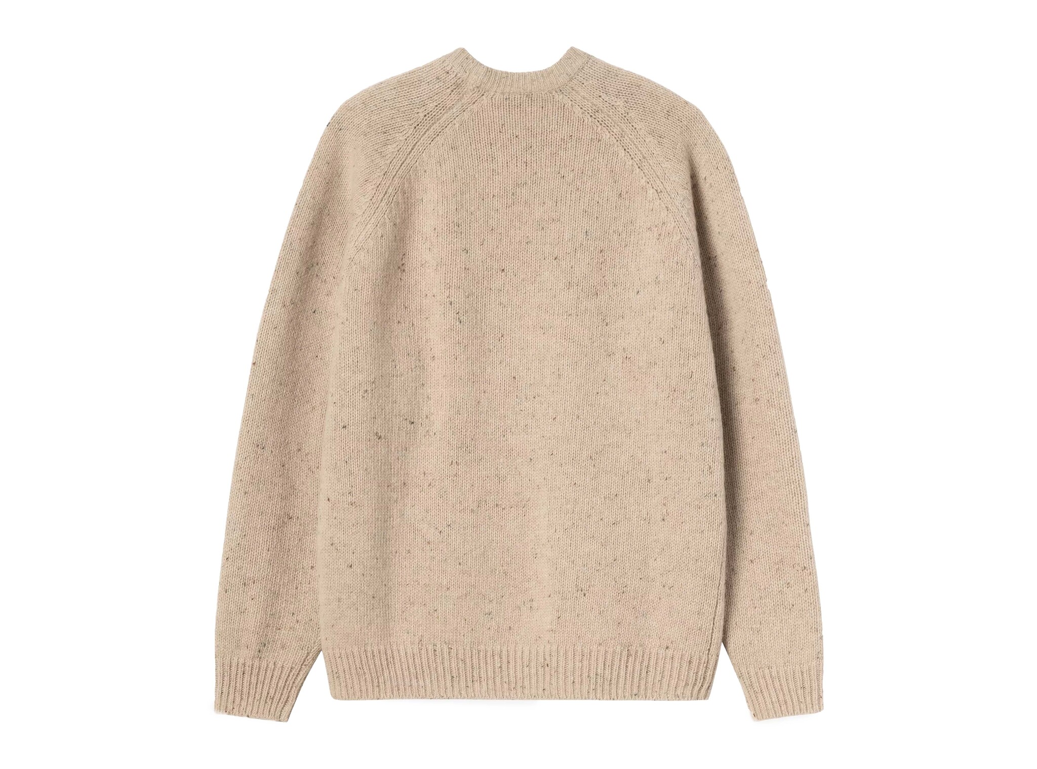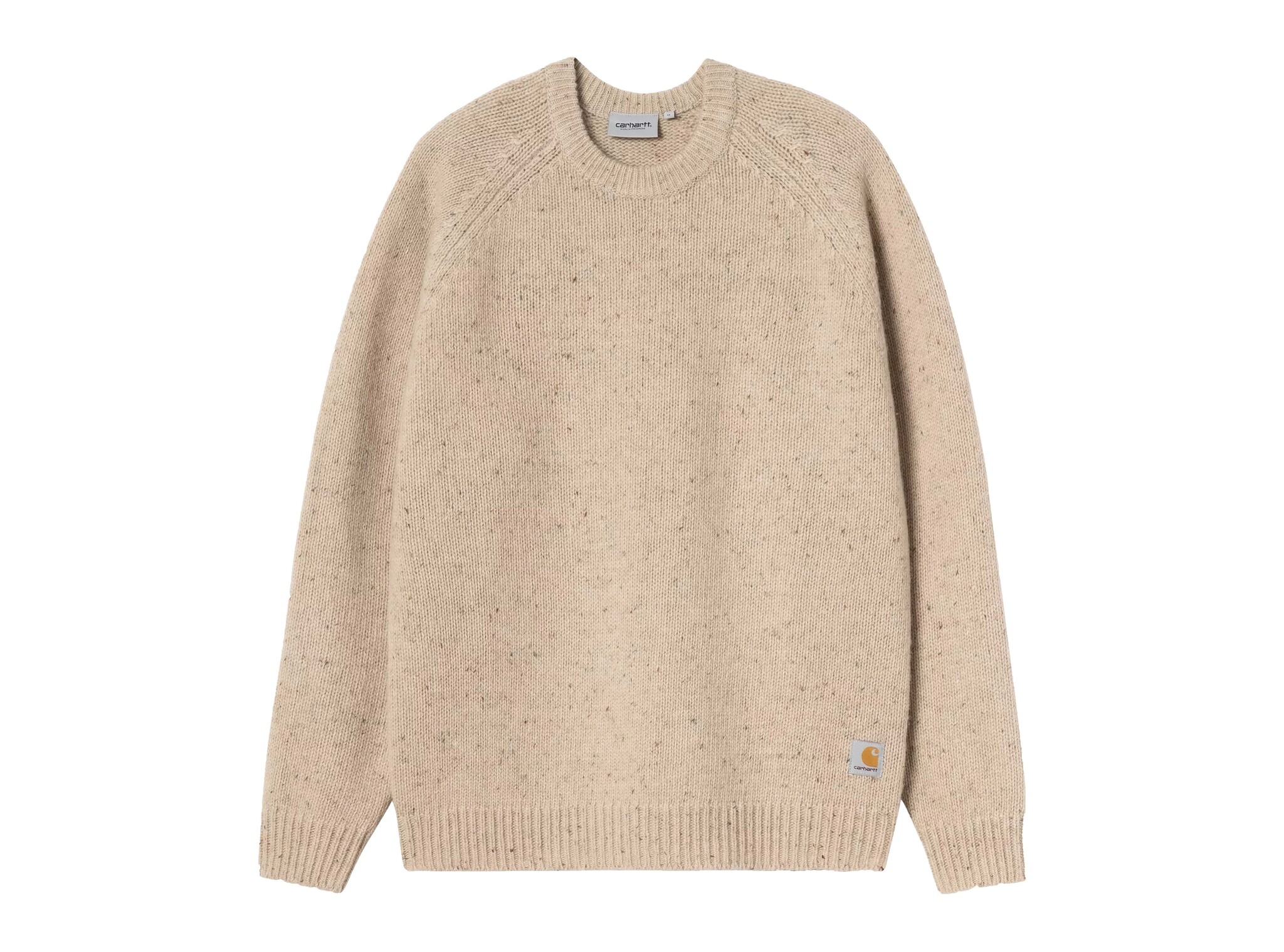 The Carhartt WIP Anglistic Sweater in Speckled Fleur De Sel is a premium knitted sweater that blends comfort and style. Made from a cotton blend with subtle colored speckles woven into the fabric, it offers a unique and vibrant look. Finished with raglan sleeves and a woven Carhartt WIP label, this versatile piece is perfect for everyday wear and easy to style for both casual and refined outfits.