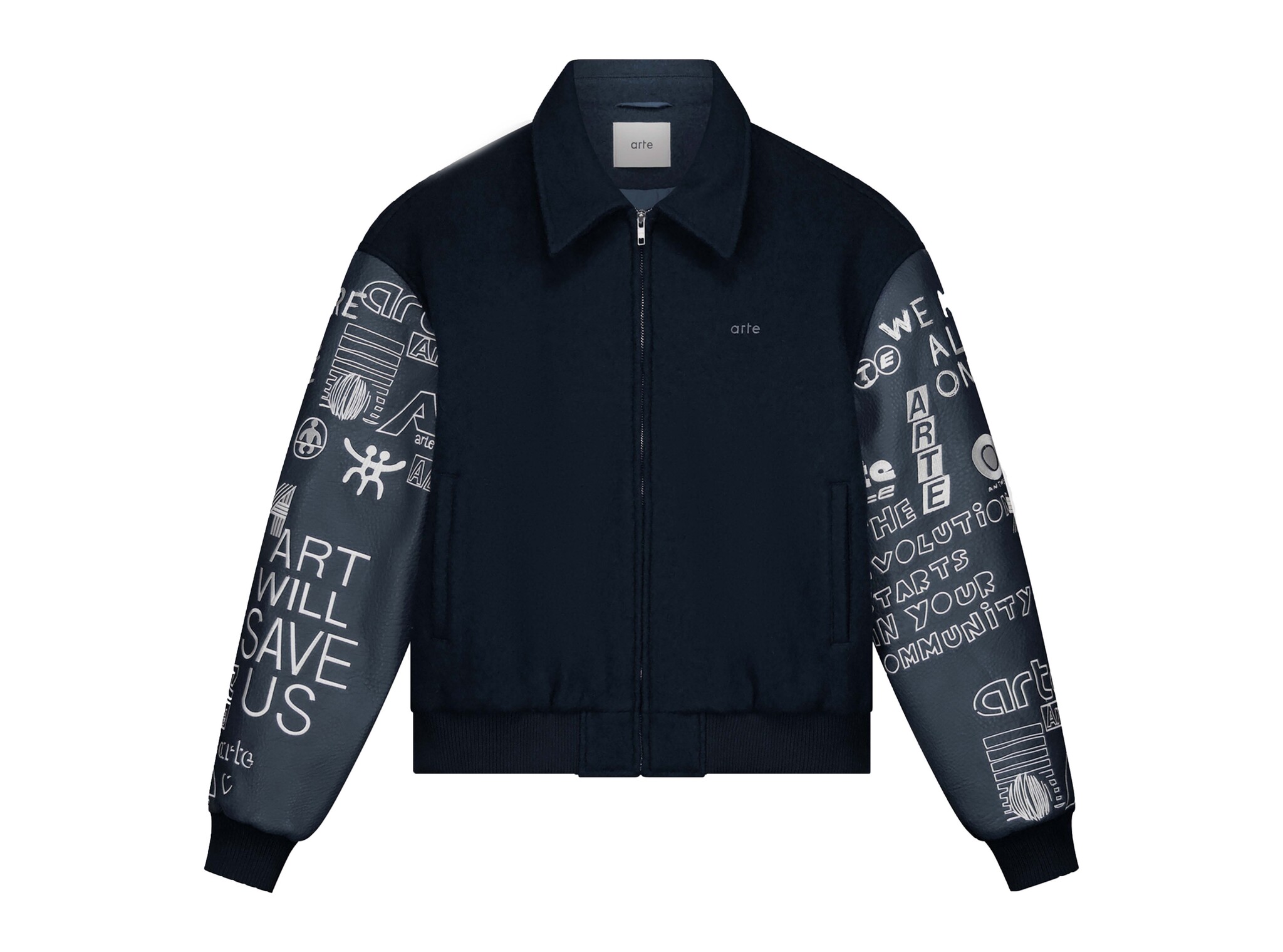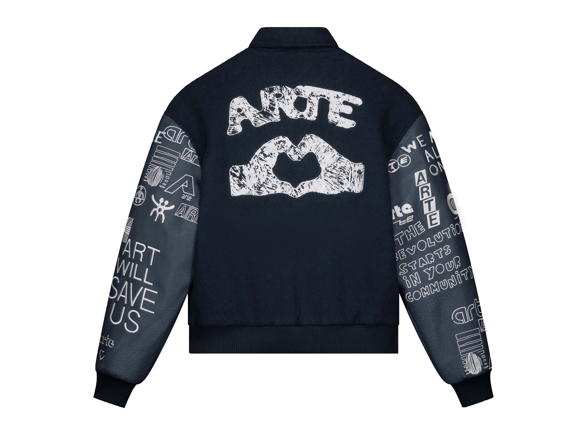The Arte Antwerp Art Saves College Jacket in Navy brings a fresh take on the classic varsity silhouette. Featuring a wool-blend body, PU leather sleeves, ribbed trims, and signature chenille patches—including the bold “Art Saves” embroidery on the back—this jacket merges collegiate heritage with Arte's contemporary design language. A standout layering piece for transitional seasons and street-ready looks.