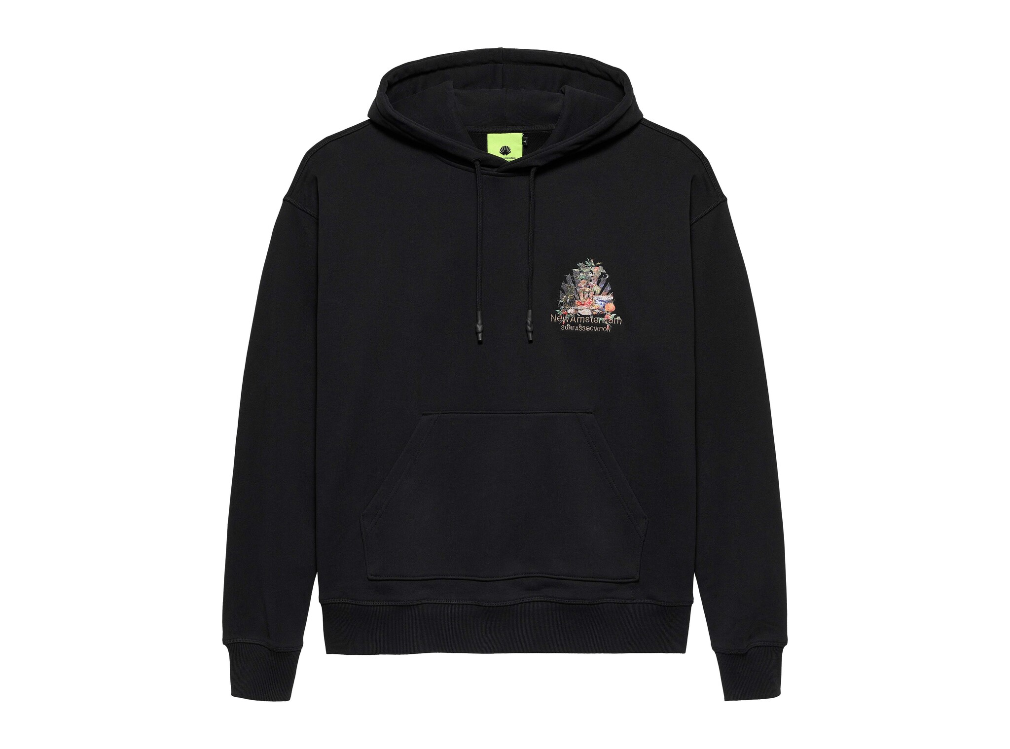 The New Amsterdam Surf Association Buffet Hoodie in Black blends minimal design with comfort and high-quality construction. Crafted from soft cotton, it features a relaxed fit and understated branding on the front, while a distinctive graphic on the back adds visual interest. Ideal for layering or wearing solo — a must-have for any modern streetwear collection.