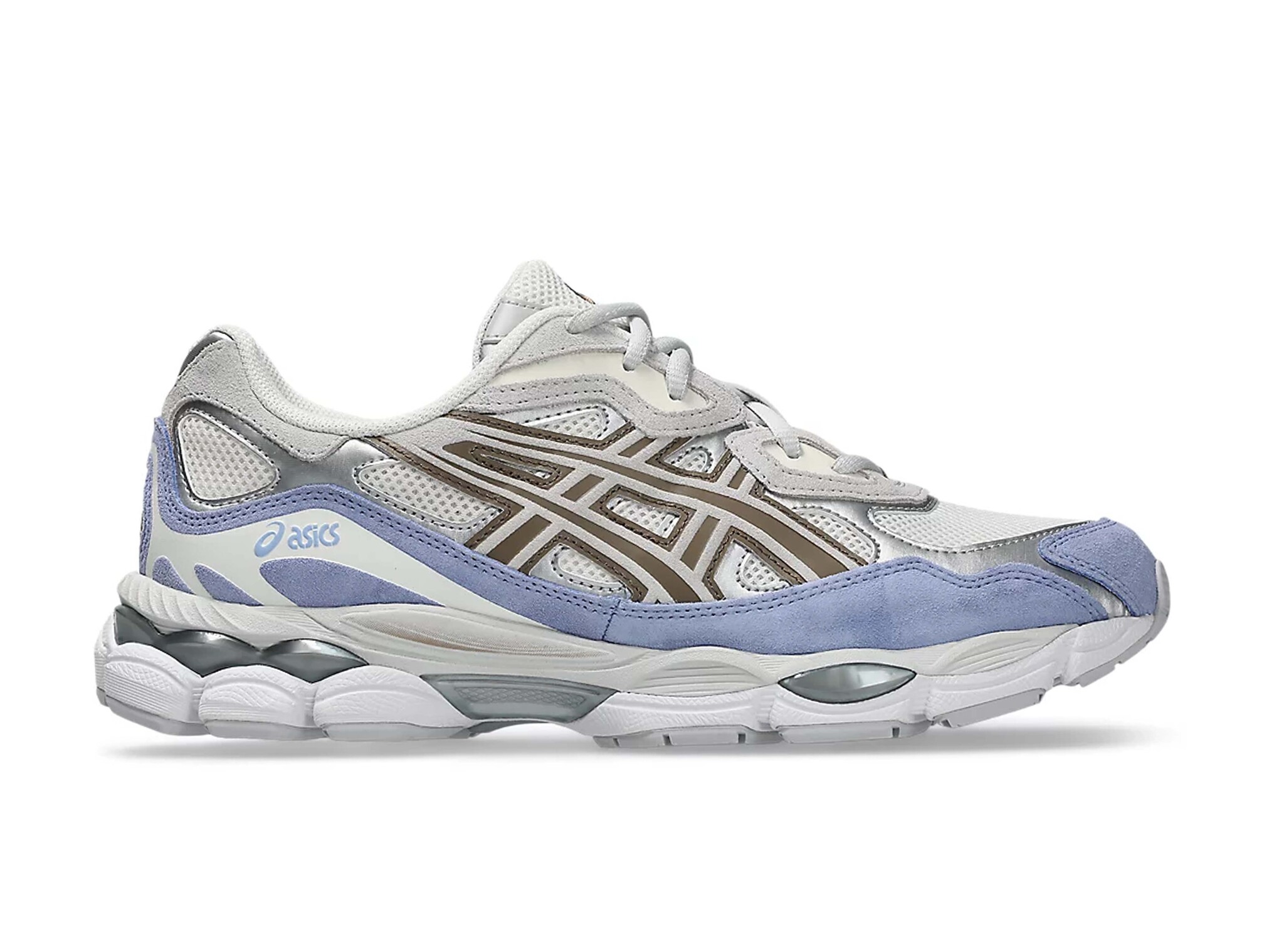 Upper material: Breathable cream mesh with grey and metallic silver overlays, periwinkle‑blue suede mudguard, and mocha-brown ASICS stripes