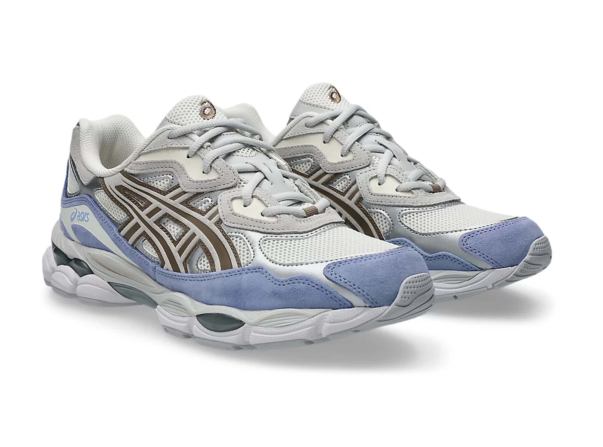 The ASICS GEL‑NYC “Cream / Cloud Grey” is a stylish summer edition released June 2025, blending retro Y2K‑era aesthetics with modern comfort tech. The upper features cream and grey mesh panels, metallic accents, a periwinkle-blue suede mudguard, and warm mocha-brown branding. Sitting atop a GEL‑Cumulus 16 midsole with dual GEL™ inserts, EVA foam, and a Stability Web outsole, this sneaker delivers plush cushioning with street-ready flair.