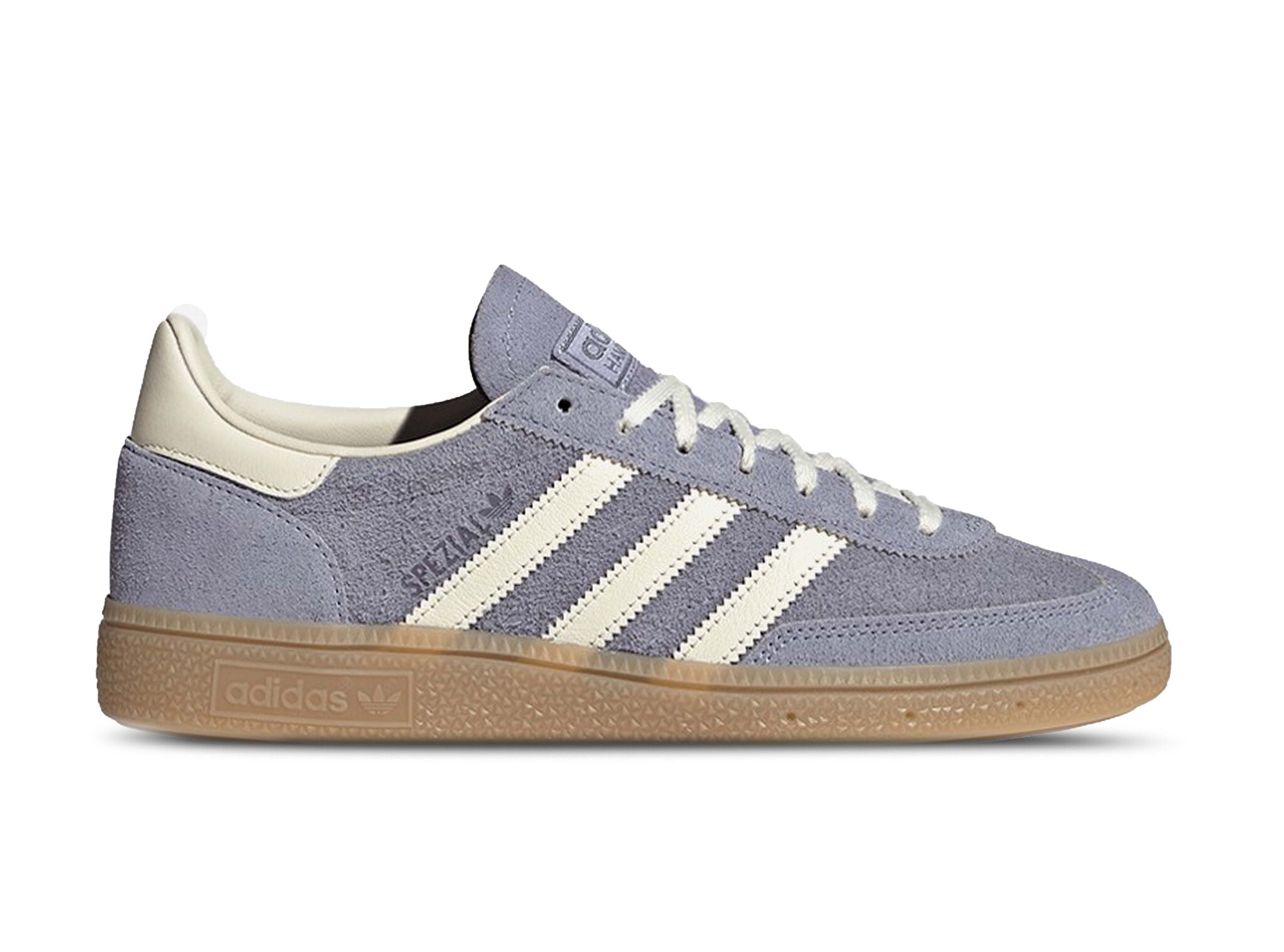 The Adidas Handball Spezial W “Silver Violet / Cream White / Gum” is a refined remake of the iconic 1979 indoor-handball trainer. It showcases washed lilac-grey suede, cream leather 3-Stripes, and a vintage gum sole. The softened suede and subtle details deliver a retro-worn finish, while suede-leather overlays and a cushioned insole provide comfort and durability. Discreet gold Spezial branding finishes the look.