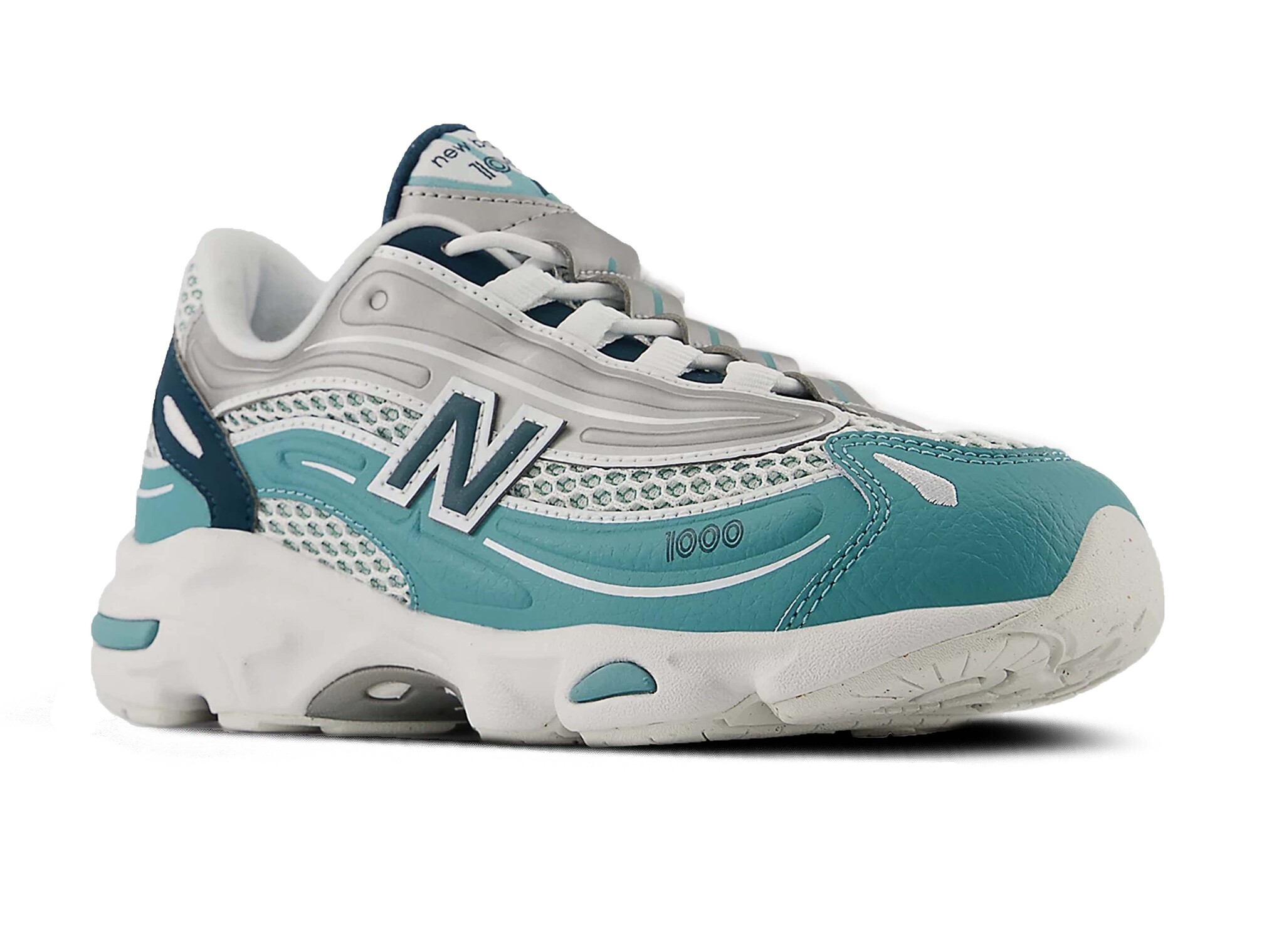 Product description: The New Balance 1000 Preschool in Faded Teal and White is a bold and retro-futuristic kids' sneaker that scales down one of New Balance's most iconic millennium-era silhouettes to preschool size. Originally launched in 1999 as one of New Balance's most forward-thinking running designs, the 1000 brings its signature inverted upper construction to young feet, with breathable mesh underlays emerging from the prominent synthetic overlay panels for a refined, tech-inspired layered look. The soft Faded Teal tone paired with crisp White accents creates a fresh and playful colourway with a cool, understated character that pairs effortlessly with any everyday outfit. The rubberised "N" logo with transparent outline adds a signature archival detail, while reflective accents improve visibility in low-light conditions. Underfoot, ABZORB cushioning at both the heel and forefoot delivers reliable impact absorption and all-day comfort for growing feet, supported by a Stability Web midfoot shank for added structure. A showstopping preschool sneaker that introduces little ones to one of New Balance's most beloved archival silhouettes.