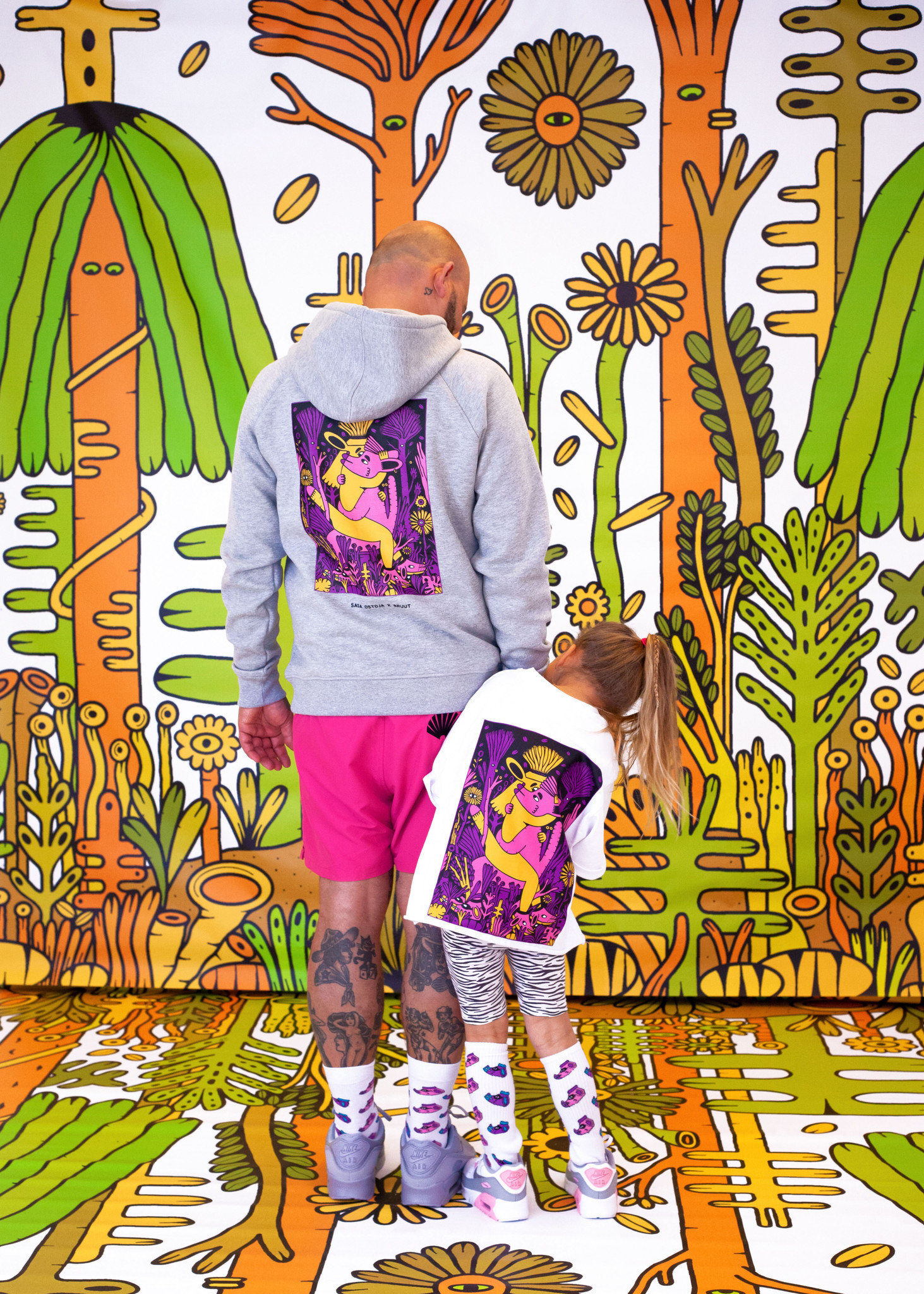 De collectie bestaat uit hoodies, t-shirts crewnecks en sokken. Het kunstwerk van Saša staat groot geprint op de achterkant van alle items en de kleurrijke tekening laat nekken zeker draaien als je langsloopt. Het is nou eenmaal iets wat je laat staren. Deze collectie heeft ook een stuk meer details dan dat je van ons gewend bent, zo is er een extra leuke tekening van Saša op de mouwen en op de borst van de items.