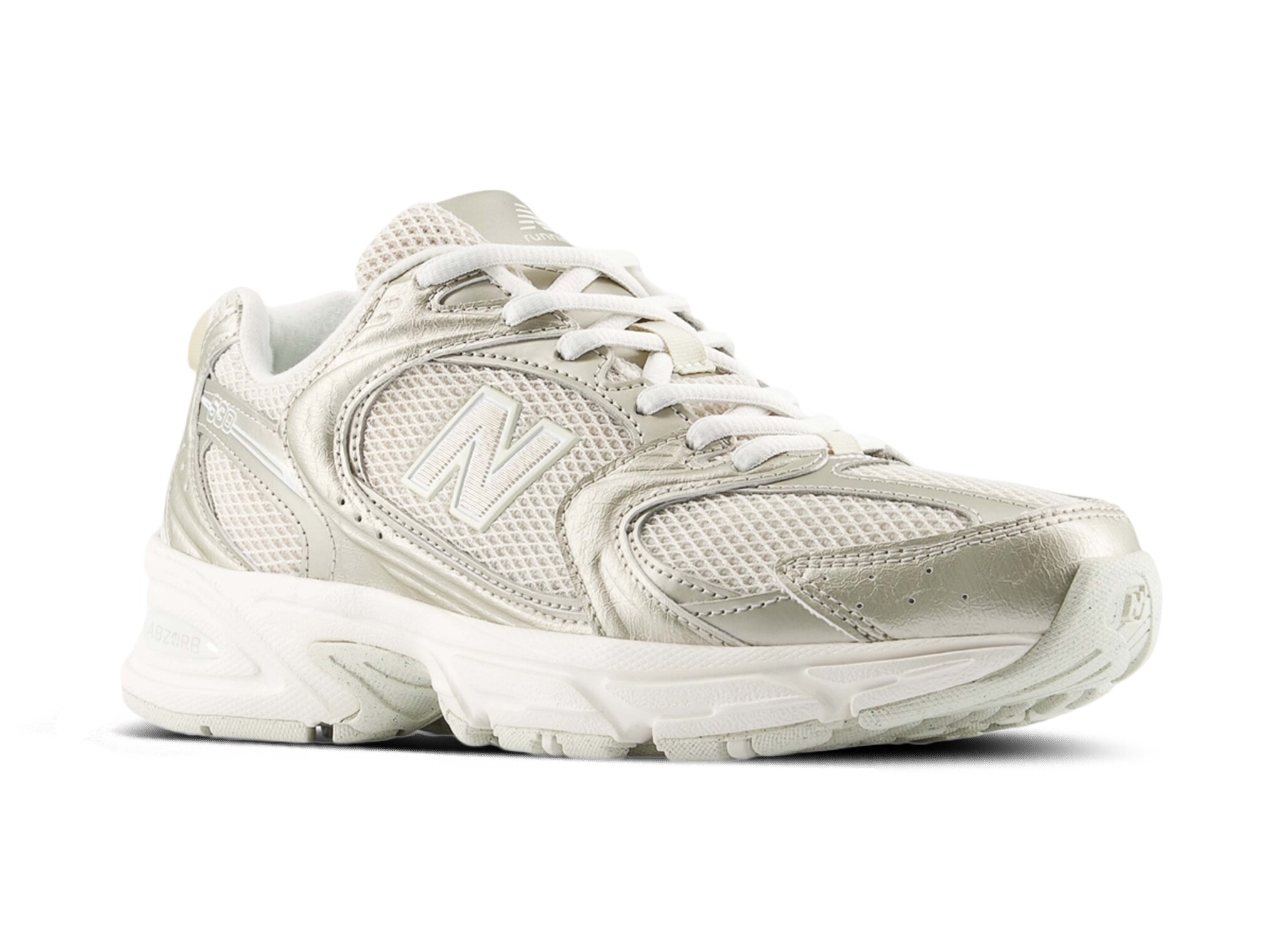 De New Balance U530 in Gold Metallic en Linen combineert een retro hardloopsilhouet met een luxe, metallic finish. Het bovenwerk van suède en mesh zorgt voor comfort en ademend vermogen, terwijl de ENCAP® middenzool stabiele en responsieve demping biedt. De glanzende gouden tinten in combinatie met zachte linnenkleuren geven de sneaker een opvallende, stijlvolle look die perfect past bij casual en streetwear outfits.