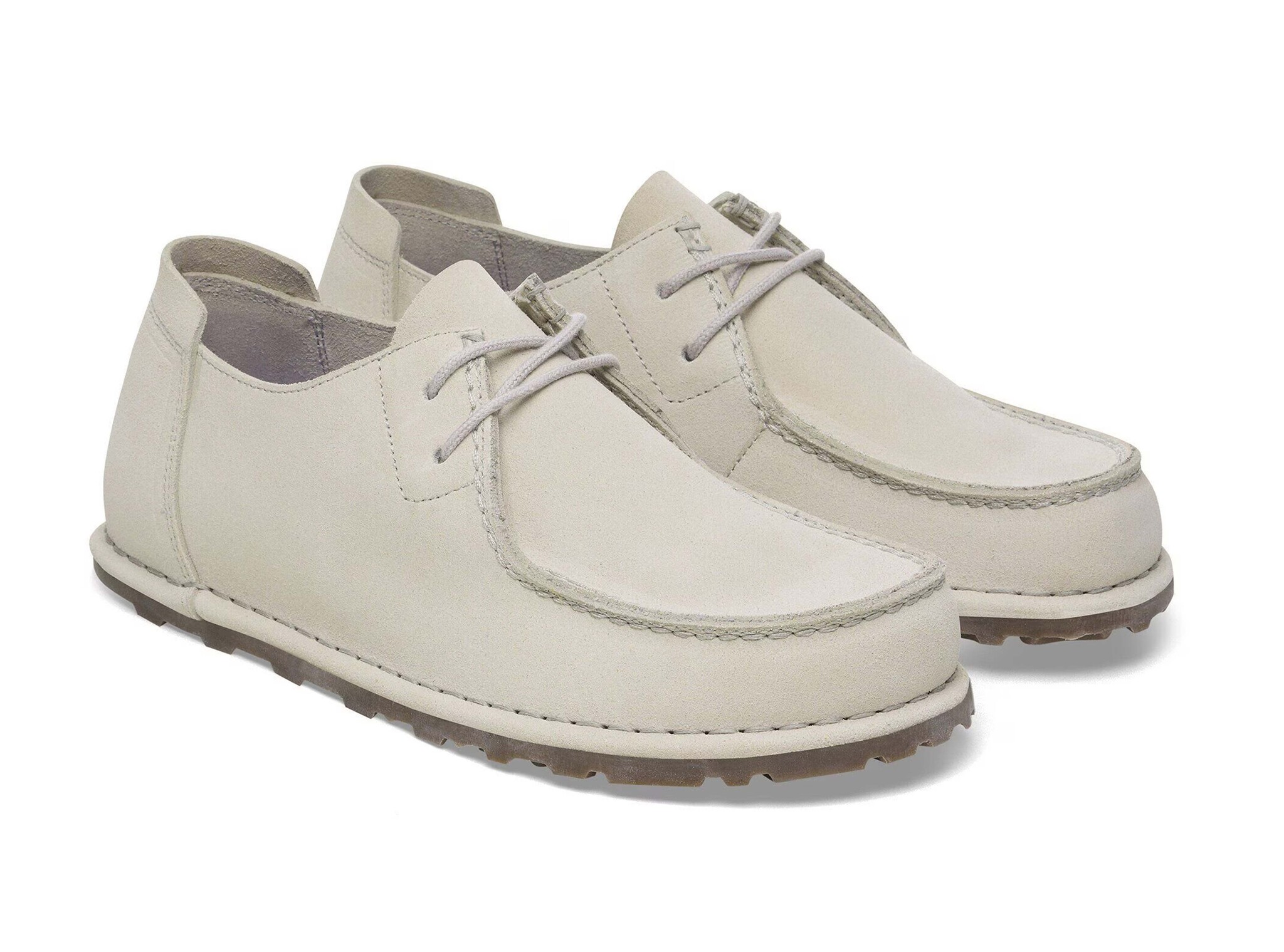 Productomschrijving: De Birkenstock Utti Lace in Antique White met smalle pasvorm is een verfijnde mocassin geïnspireerde schoen die een frisse, strakke uitstraling combineert met Birkenstocks kenmerkende dagcomfort. Het zachte suède leren bovenwerk in warm Antique White geeft de schoen een moeiteloos elegante en veelzijdige look die van nature combineert met een breed scala aan outfits, van casual zomerstijl tot smart casual ensembles. Het opvallende reliëfstiksel voegt een ambachtelijk detail toe dat de aandacht trekt, terwijl de ronde neus in mocassinstijl het silhouet strak en tijdloos houdt. De zachte hielstrop zorgt voor een moeiteloze aan en uittrekeigenschappen zonder in te boeten op pasvorm. Van binnen biedt het uitneembare BIRKENSTOCK Deep Blue voetbed, anatomisch gevormd uit een kurk en latexmengsel, uitstekende voetboogondersteuning en past zich geleidelijk aan de natuurlijke contouren van de voet aan. De vochtafvoerende microvezel voering houdt de voeten de hele dag fris. De natuurlijke kurk en rubbermix buitenzool biedt betrouwbare grip en duurzaamheid. Een veelzijdige unisex dagelijkse schoen voor smallere voeten, gebouwd op Birkenstocks erfgoed van comfort sinds 1774, gemaakt in Portugal.