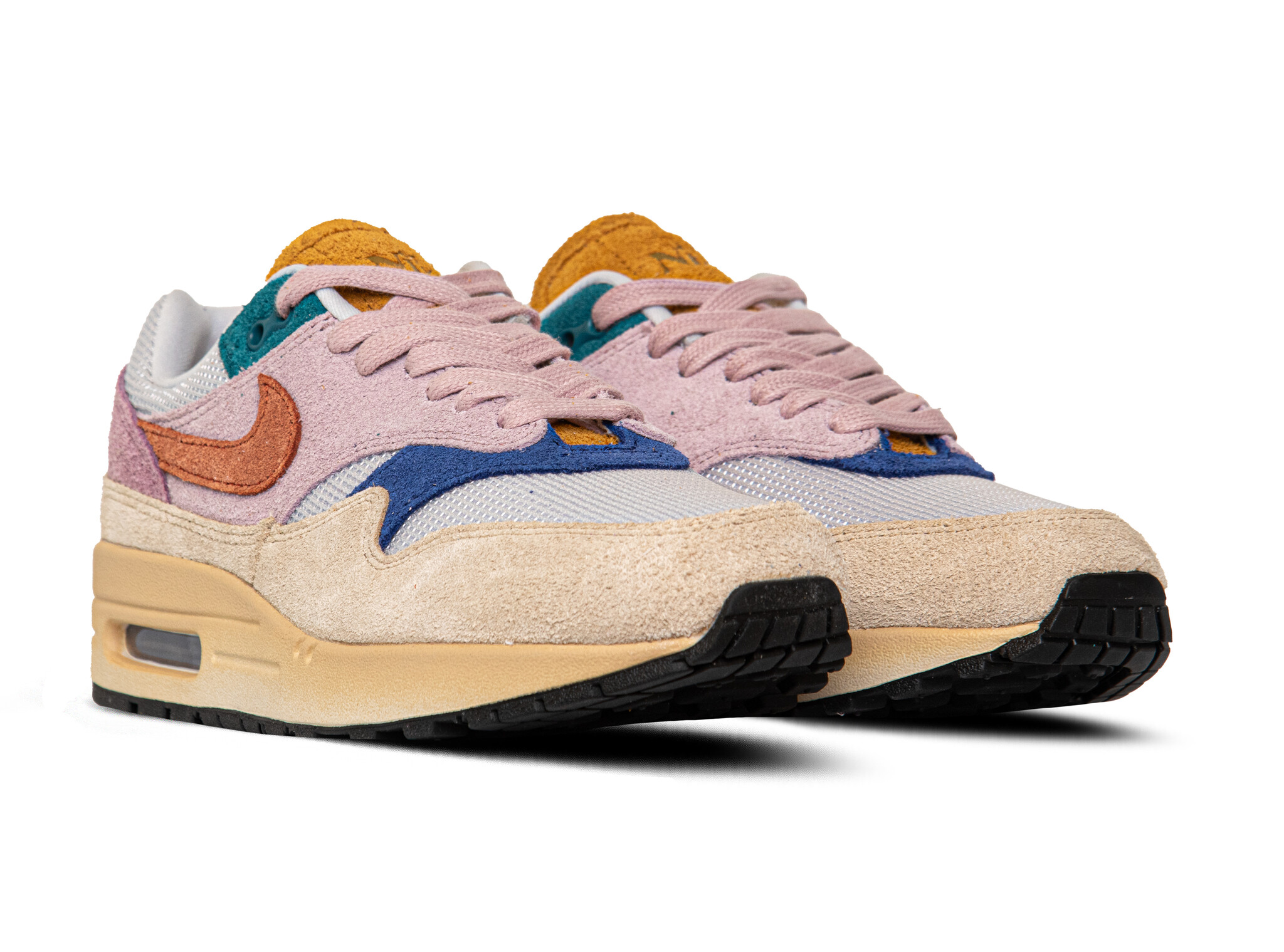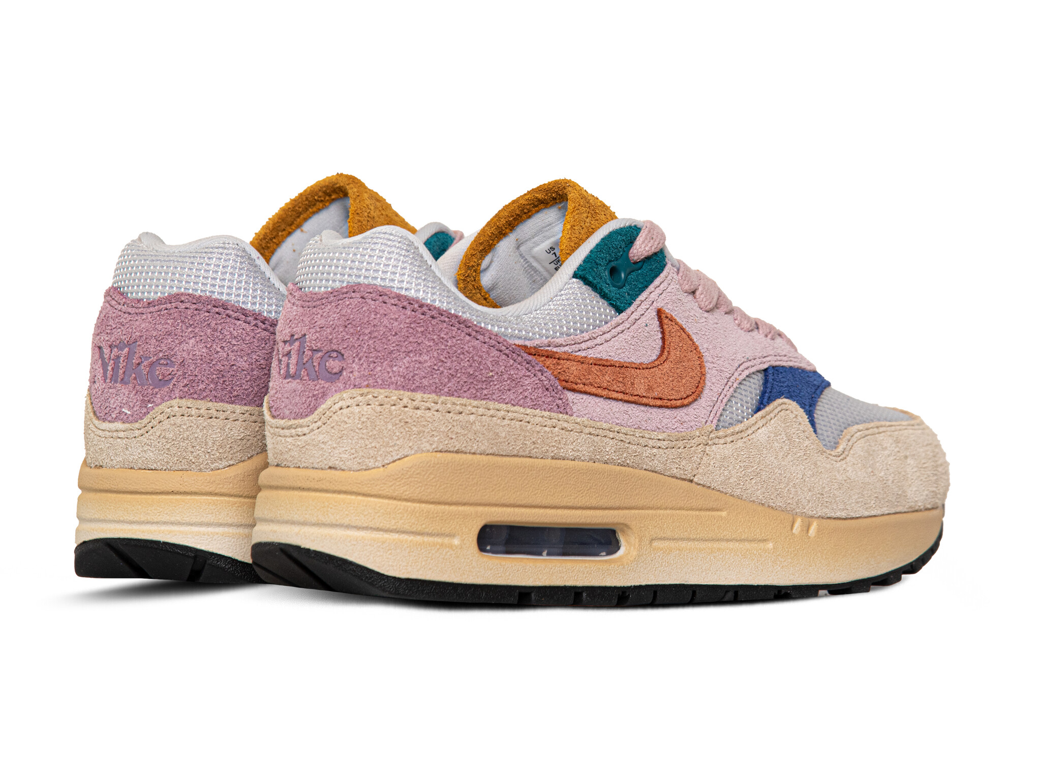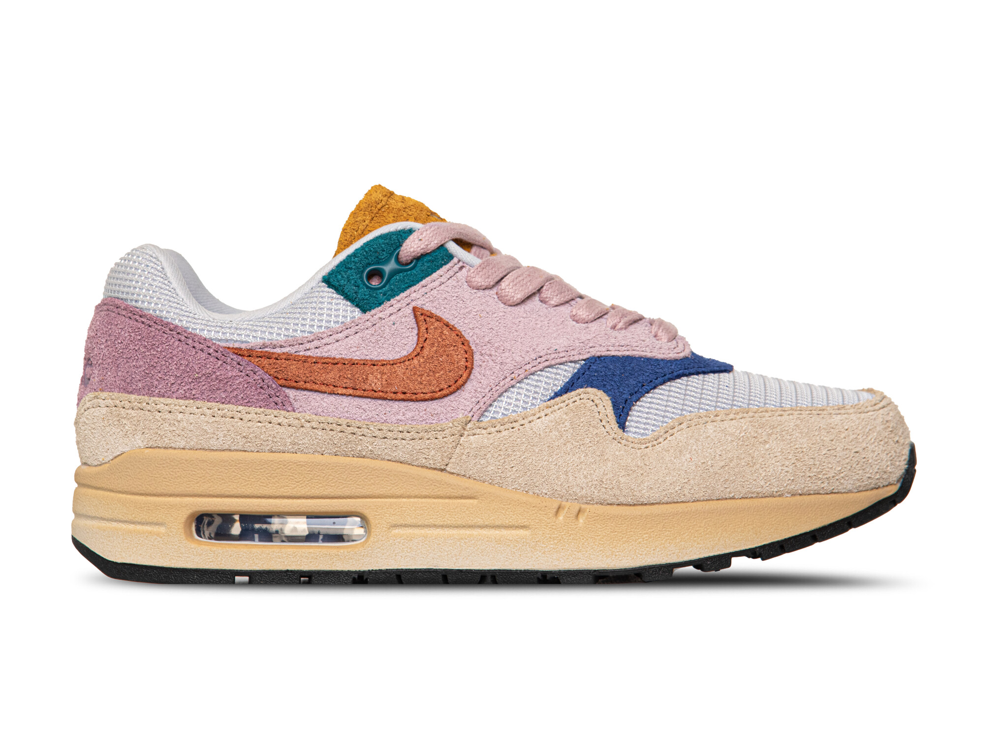 De Nike Air Max 1 '87 PRM in de kleurstelling Grain / Rugged Orange / Plum Fog / Violet Dust is een damessneaker die retro hardloopstijl combineert met moderne technologie. Het bovenwerk van ademend mesh met suède overlays zorgt voor comfort en ondersteuning. De rubberen zool met zichtbare Air-unit biedt uitstekende schokabsorptie en stabiliteit. Deze sneaker is ideaal voor dagelijks gebruik en biedt een stijlvolle uitstraling.